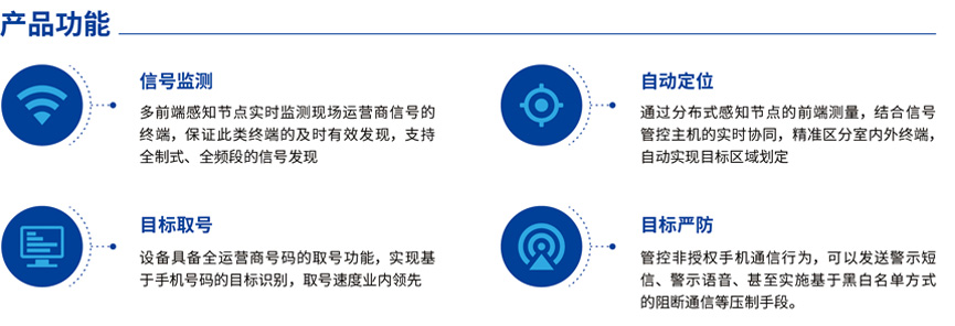 敏感場所手機(jī)精準(zhǔn)管控系統(tǒng)是針對敏感場所傳統(tǒng)手機(jī)管控設(shè)備存在漏管誤管、無法區(qū)分內(nèi)外、無法自動定位、部署不靈活等問題,從客戶需求和實(shí)戰(zhàn)應(yīng)用出發(fā),自主研制出的機(jī)動靈活、高速篩選區(qū)分、智能劃片/定位的手機(jī)管控領(lǐng)域“黑科技”產(chǎn)品。系統(tǒng)采用高速篩別處理技術(shù)、多節(jié)點(diǎn)協(xié)同定位技術(shù)以及智能管控流程,及時區(qū)分和發(fā)現(xiàn)敏感場所內(nèi)非授權(quán)手機(jī),管控其通訊行為,自動執(zhí)行目標(biāo)位置區(qū)域劃定并在后臺圖形化呈現(xiàn),快速及時掌控、清除非授權(quán)手機(jī),保障相關(guān)場所的信息安全。